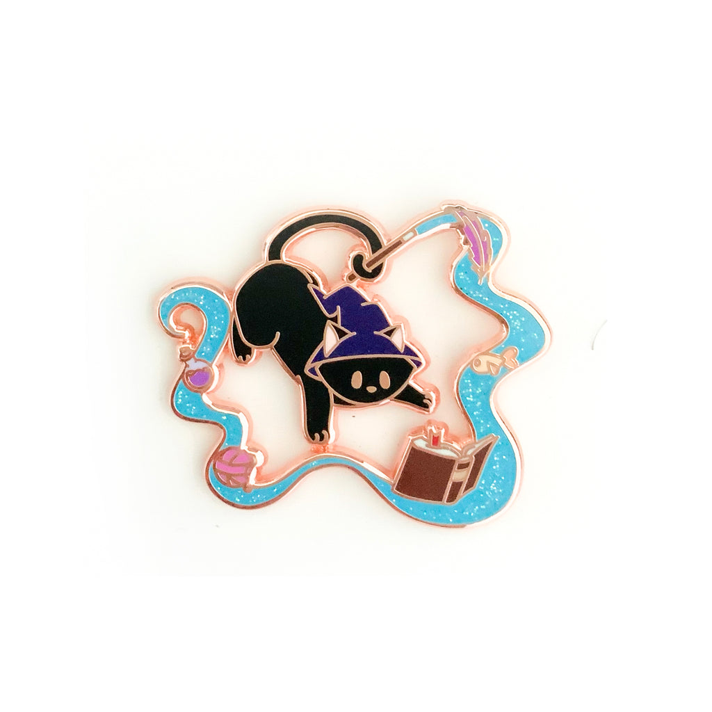 Meet your magical new companion — a mischievous black cat caught mid-spell! Wearing a tiny wizard hat and surrounded by floating trinkets, potions, and a spellbook, this adorable familiar brings a touch of enchantment wherever it goes. The shimmering aqua glitter enamel flows like stardust, framing the scene in soft rose gold magic. Whether you’re a cat lover, a cozy witch at heart, or simply enchanted by whimsical things, this pin is pure spellbinding charm.